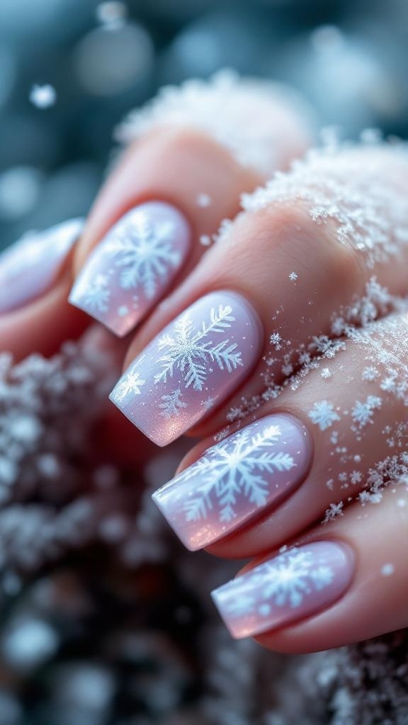 Winter is a magical season, and what better way to celebrate it than with stunning frost-themed nails? The image showcases a beautiful nail design featuring delicate snowflakes on a soft, shimmery background. Each nail captures the essence of winter, making them perfect for holiday gatherings or cozy nights in.